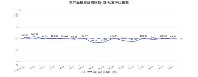 2025年第24周(6月14日—6月20日),北京市农产品批发价格指数环比为99.92,下降0.08%;同比为106.79,上涨6.79%。