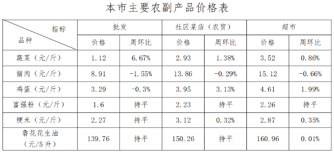 本轮强降雨期间本市各类农副产品供应充足,本周(7月26日-8月1日)蔬菜价格受降雨影响规律性上涨,鸡蛋零售价格滞后性跟涨,其他品类价格稳中有降。从全国价格水平看,北京市猪肉、蔬菜和鸡蛋零售均价在36个大中城市中,从高到低排名分别为第30、29和22位,均低于全国平均价格水平。1.受强降雨天气影响,蔬菜批发价格在正常区间上涨,仍处于近三年同期低位,零售价格小幅波动。叶类和茄果类蔬菜的生产和储存受降雨影响较大,拉动批发价格整体上涨。25种蔬菜17涨1平7降(涨幅前三的为:大白菜29.79%、菠菜24.82%、小白菜20.57%)。批发、社区菜店、连锁超市价格分别为每斤1.12元、2.93元、3.52元,周环比(较强降雨发生前)涨幅分别为6.67%、1.38%、0.86%。2.猪肉批发价格小幅下降,处三年低位。本周猪粮比价为6.56:1,周环比下降2.38%,处于合理区间运行。白条猪批发、精瘦肉农贸及超市价格分别为每斤8.91元、13.86元、15.12元,周环比涨幅分别为-1.55%、-0.29%、-0.66%。3.受前一周鸡蛋批发价格上涨影响,零售价格滞后性跟涨。鸡蛋批发、农贸、超市价格分别为每斤3.29元、3.95元、4.61元,周环比涨幅分别为-0.3%、3.13%、1.99%。4.粮油供应充足,价格基本稳定。