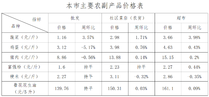 本周(8月2日-8日)各类农副产品供应有保障,蔬菜批发价格涨势趋缓,鸡蛋批发价格继续回落。从全国价格水平看,北京市猪肉、蔬菜和鸡蛋零售均价在36个大中城市中,从高到低排名分别为第29、29和23位,均低于全国平均价格水平。1.蔬菜批发价格涨幅收窄,零售价格补涨。上一轮降雨天气影响减弱,蔬菜批发价格涨势趋缓,叶类和茄果类蔬菜仍为推动批发价格上涨的主要动力。25种蔬菜价格环比15涨1平9降(涨幅前三的为:菠菜28.69%、菜花24.68%、油菜24.52%)。批发、社区菜店、连锁超市价格分别为每斤1.16元、2.98元、3.66元,周环比涨幅分别为3.57%、1.71%、3.98%。2.鸡蛋批发价格继续回落。鸡蛋整体供大于求,价格缺乏上涨动力,本周批发价格再次下降。鸡蛋批发、农贸、超市价格分别为每斤3.12元、3.98元、4.63元,周环比涨幅分别为-5.17%、0.76%、0.43%。3.猪肉价格保持稳定。本周猪粮比价为6.76:1,周环比上涨3.05%,处于合理区间运行。白条猪批发、精瘦肉农贸及超市价格分别为每斤8.86元、13.88元、15.15元,周环比涨幅分别为-0.56%、0.14%、0.2%。4.粮油供应充足,价格基本稳定。