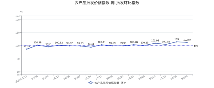本周农产品批发价格指数环比持续稳中有涨。其中,由于北方产区强降雨对蔬菜生产造成的影响明显减弱,蔬菜批发价格涨势放缓;随着国家发展改革委将会同有关部门开展中央冻猪肉储备收储,学校开学集中备货,猪肉批发价格由降转涨,猪粮比价为6.5:1;近期鸡蛋市场供应充足,糕点厂鸡蛋采购量增加,鸡蛋批发价格以稳为主。