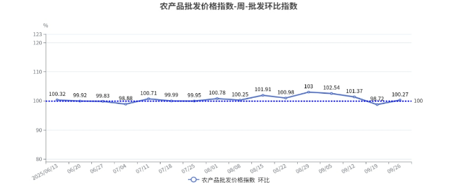 2025年第38周(9月20日—9月26日),北京市农产品批发价格指数环比为100.27,上涨0.27%;同比为89.82,下降10.18%。