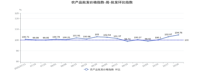 2025年第42周(10月18日—10月24日),北京市农产品批发价格指数环比为104.76,上涨4.76%;同比为103.35,上涨3.35%。