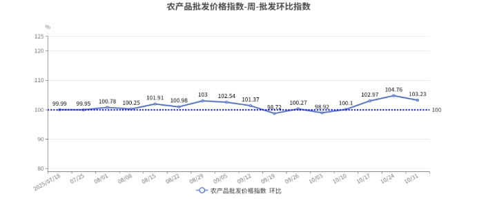 2025年第43周(10月25日—10月31日),北京市农产品批发价格指数环比为103.23,上涨3.23%;同比为108.57,上涨8.57%。