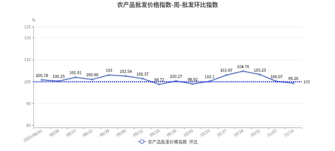 2025年第45周(11月8日—11月14日),北京市农产品批发价格指数环比为99.26,下降0.74%;同比为116.74,上涨16.74%。
