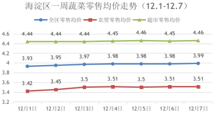 上周,海淀区蔬菜零售均价呈小幅上涨趋势。周零售均价为3.97元/500克,环比小幅上涨2.47%。其中,农贸零售均价3.49元/500克,环比小幅上涨2.35%;超市零售均价4.45元/500克,环比小幅上涨2.5%。监测的31种蔬菜单品中22涨8降1平。周均价上涨的22种蔬菜中涨幅超过10%的蔬菜为:大白菜25.42%、菜花19.2%、大葱10.91%,涨幅区间在5%-10%的9种蔬菜为:圆白菜9.86%、黄瓜9.79%、心里美萝卜7.25%、菠菜6.92%、圆茄子6.90%、小白菜6.48%、土豆6.07%、蒜苗5.69%、冬瓜5.11%,涨幅区间在1%-5%的7种蔬菜为:油菜4.18%、油麦菜3.81%、白萝卜3.59%、平菇3.34%、尖椒2.79%、胡萝卜1.74%、生姜1.54%,涨幅在1%以下的蔬菜3种蔬菜为:绿豆芽、苦瓜、大蒜。周均价下降的8种蔬菜为:莴笋15.8%、韭菜5.56%、葱头3.49%、芹菜2.56%、生菜1.73%、青椒0.64%、豆角0.54%、西红柿0.37%。黄豆芽环比持平。