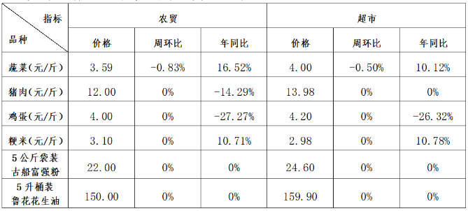 节日期间(1月1日-3日),我区主要农副产品价格以稳为主。由于气温总体偏高,有利于蔬菜生长,前期受灾影响的蔬菜生产基本恢复,供应链逐步趋于平稳顺畅,预计后期菜价将成稳中有降走势,特别是部分叶菜还有进一步回落空间;鸡蛋、猪肉市场供应充足,后期还将持续低位运行;粮油产品持续稳定。