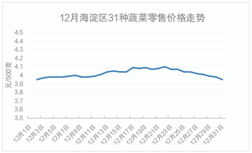 12月,海淀区蔬菜月均价为4.02元/500克,环比11月均价上涨3.08%。单日价格区间为3.93-4.1元/500克,整体价格呈波动调整趋势。月初价格开于本月最低价3.93元/500克,后持续微幅上涨,22日价格涨至本月最高价4.1元/500克,后微幅回落至月底,价格达到3.95元/500克,月末较月初价格上涨0.51%。