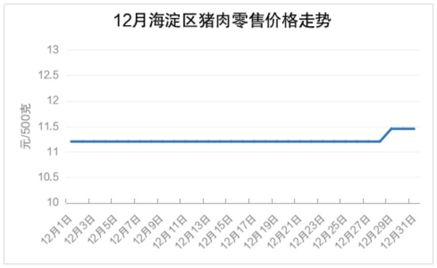 12月份,海淀区猪肉月均价为11.22元/500克,环比11月份下降2.94%。本月猪肉单日价格区间为11.2-11.45元/500克,整体价格呈稳中有涨趋势。月初价格开于本月最低价11.2元/500克,持续运行至28日上涨至本月最高价11.45元/500克,保持至月底。月底较月初价格上涨2.23%。海淀区发展和改革委员会2025年12月31日