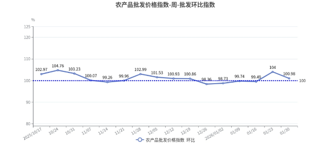 2026年第4周(1月24日—1月30日),北京市农产品批发价格指数环比为100.98,上涨0.98%;同比为102.33,上涨2.33%。