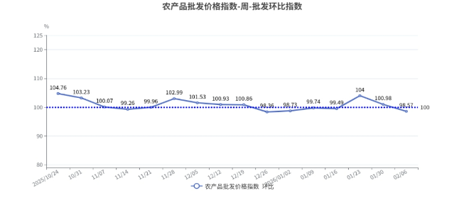 2026年第5周(1月31日—2月6日),北京市农产品批发价格指数环比为98.57,下降1.43%;同比为104.62,上涨4.62%。